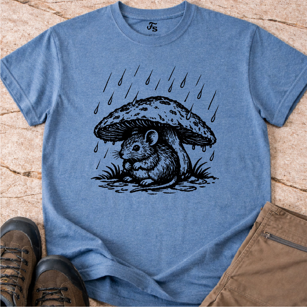 This unisex T-shirt features a charming woodland illustration of a small mouse sheltering from the rain beneath a mushroom cap. The design has a cozy, storybook feel with hand-drawn linework that evokes nature, calm moments, and forest life.